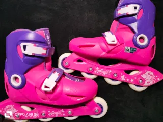 Patines en línea para niña, usados pero en buen estado. Ideales para principiantes. - Color: Rosa y gris - Talla: Ajustable (ver foto para tallas exactas) - Incluye un par de patines.