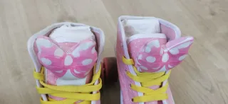 Patines de niña con diseño de Minnie Mouse., en su caja original - Ruedas en paralelo - Color rosa con lunares blancos - Adorno de lazo de Minnie en la Lengüeta de cada patín. - Cordones amarillos. - Talla 30