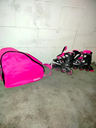 Patines en línea de color rosa, marca Oxelo, diseñados para niñas. Incluyen bolsa de transporte. - Talla ajustable: 34-36 EU. - Cierre con velcro y hebillas. - Ruedas de poliuretano. Regalo el casco y bolsa con coderas y rodilleras.