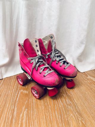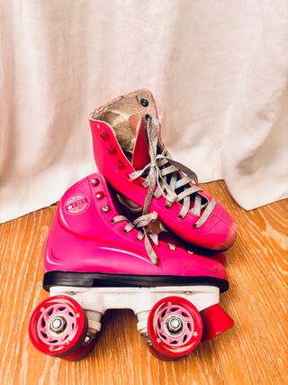 Patines de niña en color rosa, talla 33. Perfectos para iniciarse en el patinaje. - Diseño alto para mayor sujeción. - Cordones plateados. Desgaste de uso en punteras, ruedas y frenos.