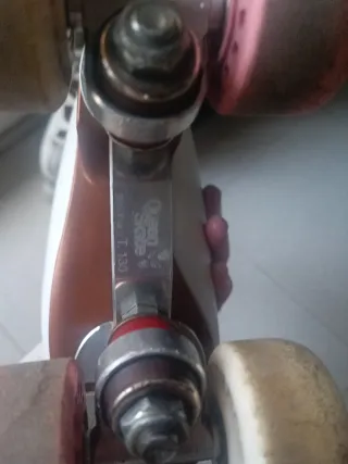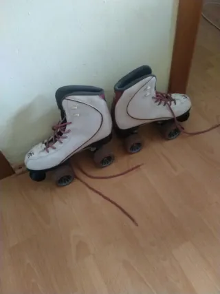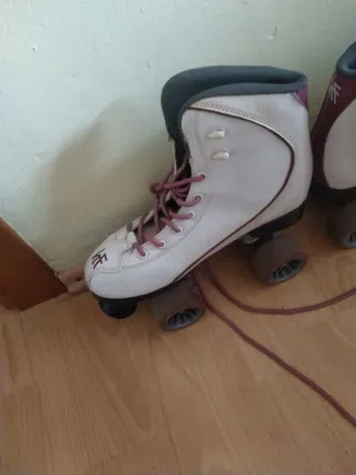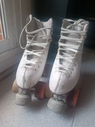 Se venden patines profesionales en color blanco con detalles en burdeos y cordones a juego. - Diseño alto para soporte de tobillo. - Ruedas de color marrón oscuro. Número 40