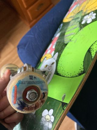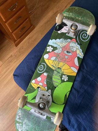 Patín skateboard con diseño en la parte trasera. como nuevo. - Diseño artístico en la tabla. - Ruedas blancas. marca decathlon, apenas usado. solo venta en persona