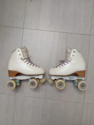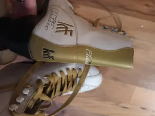 Se venden patines profesionales en color blanco y dorado, talla aproximada 35. - Diseño clásico y elegante. - Ruedas doradas. - Cordones dorados a juego.