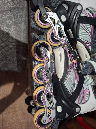 Se venden patines en línea profesionales. - Diseño en blanco, negro y morado. - Ruedas de 76mm. - Cierre de velcro y hebilla.