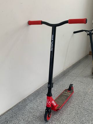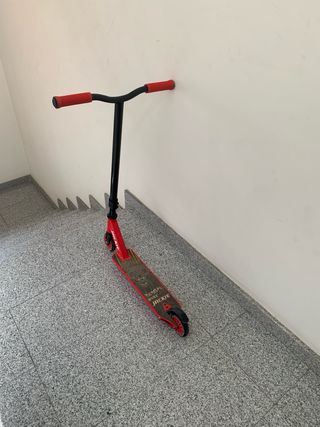 Patín de estilo libre con manillar en forma de T y ruedas de 100 mm. - Manillar con puños de goma. - Ruedas de 100 mm con llantas rojas. - Freno trasero. - Plataforma antideslizante. - Ruedas de recambio nuevas trasera y delantera.