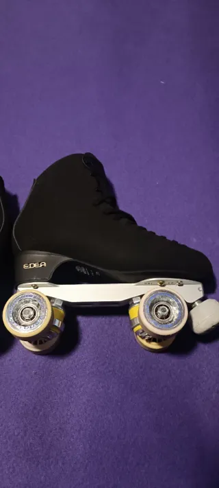 Patines para patinaje artístico. Las planchas son Queen Skate de talla 150, las ruedas Komplex y las botas Edea talla 250 (se supone que es 37-37,5 según las tablas, pero creemos que es algo menos, porque nuestra hija tenía menos talla). Las podemos entregar con tratamiento de ozono, ya que tenemos máquina.