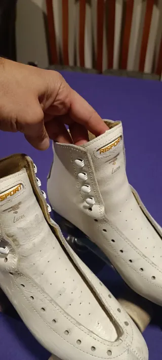 Patines profesionales Risport modelo Laser. - Talla 260. - Color blanco. - Diseño con cordones. - Material de cuero y gamuza. - La bota es de cuero y se encuentra en muy buen estado como se ve en la foto, como también lo están los frenos y ruedas.
