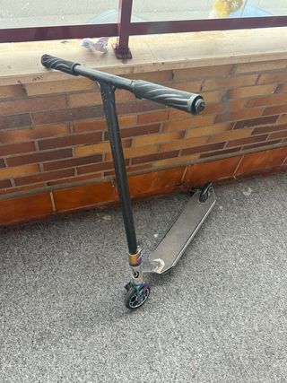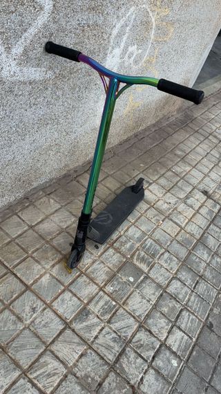 Patín profesional para freestyle. - manillar stricker en T -tabla stricker las más ancha -puños Etick morados -horquilla AO Scooter -dirección tilt en morado -clan scs ruedas 110 mm del decatlón lija tilt SIN FISURAS SE HACE CAMBIO POR IPHONE 16 o 17
