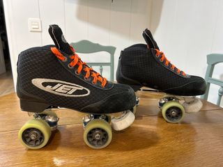 Patines de hockey profesionales en color negro con cordones naranjas. - Marca JET. - Talla 37-38. Se hicieron a medida con rodamientos, ruedas y frenos de primera calidad y en perfecto estado. Nuevos fueron 300 euros, tienen una temporada de uso.