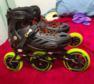 Patines en linea profesionales de velocidad marca Canariam Black Magic con tres ruedas de 110 y llamativas. El diseño es moderno y deportivo. - Patines ajustables 40, 41 y 42 - Ruedas de 110 MM. - Marco de aluminio CNC reforzado. - Cierre de velcro, cordón y hebilla. - Accesorios: protección rodilleras, codilleras, muñequeras, casco marca Rock Rider. - Llave de cambio de ruedas. - Casi nuevos. - Obsequio bolsa para guardar los protectores y antitranspirante para el casco.