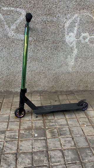 Patín diseñado para la práctica de freestyle y trucos. - Manillar negro con puños verdes. - Plataforma de patín plateada. - Ruedas nuevas de distinto diseño