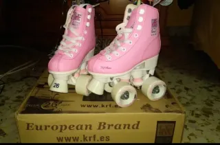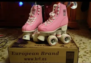 Se venden patines profesionales en color rosa, talla 26. - Diseño clásico de bota alta. - Ruedas blancas con detalles rosas. - Cordones blancos. - Marca KRF.