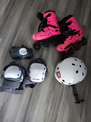 Conjunto de patines profesionales en línea de color rosa núm 41. - Patines en línea de color rosa y negro. - Marca Polderflide KHAAN. - Casco de protección blanco. - Rodilleras, muñequeras y coderas de protección.