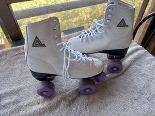 Se venden patines profesionales de cuatro ruedas en color blanco. Listos para usarse. - Diseño clásico y elegante. - Ruedas de color morado. - Cierre con cordones blancos.