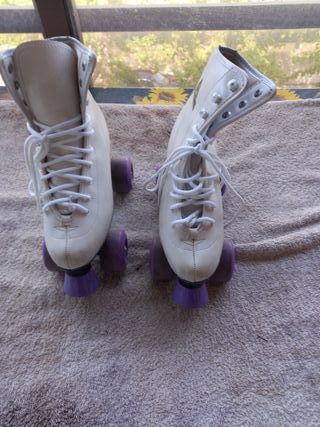 Patines de cuatro ruedas de estilo profesional. - Color blanco. - Cordones blancos. - Ruedas de color. - Marca ROL en las ruedas. Equivale a una talla 34