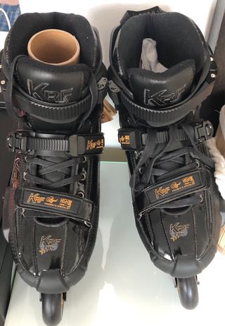 Patines en línea KRF Angel de nivel profesional, ideales para patinaje. - Marco de aluminio. - Ruedas de 243 mm (máx. 80 mm). - Diseño en color negro con detalles dorados.