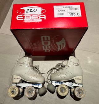 Patines profesionales de la marca Edea, ideales para patinaje artístico. - Diseño en color blanco. - Cierre con cordones. - Ruedas de patinaje. - Con herramientas para poder. desmontar las ruedas. - Bota talla 190 equivalente a un 28