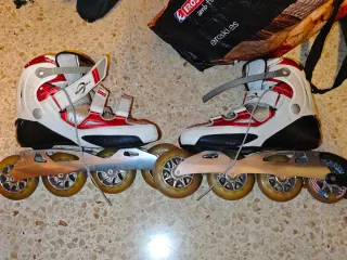 Se venden patines en línea con un diseño llamativo en blanco y rojo. Talla 45 - Ruedas de color ámbar. - Cierre con velcro y cordones. - Marco metálico plateado.
