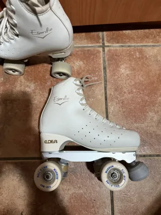 Patines profesionales Edea Sordio en color blanco. Diseñados para un alto rendimiento. - Diseño alto y ajustado. - Cierre con cordones. - Ruedas de patinaje. - Cumplen normativa para competición. -1 año y medio de uso ( su precio nuevos era de 300 euros). -Talla 225, para un 30/32 de pie.