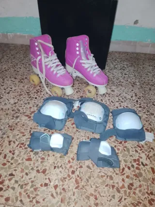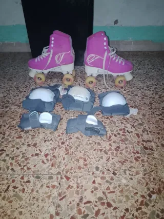 Set de patines profesionales en color rosa, con muy poco uso. - Incluye rodilleras de protección. - Diseño moderno y llamativo. - Ruedas de alta calidad para un deslizamiento suave.
