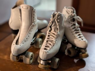 Dos pares de patines. Un par de escuela, sin frenos, y otro par de patines con frenos.