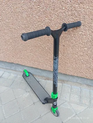 Patín scooter profesional con un diseño llamativo en color verde y blanco. - Puños con diseño camuflaje verde. - Plataforma con detalles gráficos. - Ruedas de 100mm.