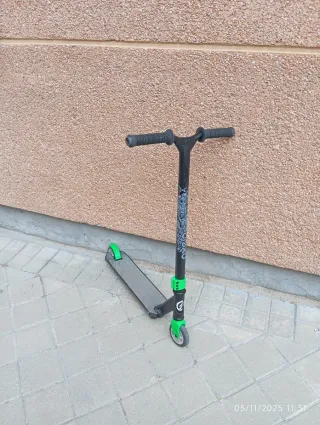 Patín de estilo libre con manillar negro y detalles en verde. - Manillar con puños de goma. - Plataforma de patín gris. - Ruedas delanteras y traseras verdes. - ideal para aprendizaje de trucos de salto y deslizamiento