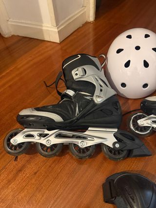 Patines Rollerblade ajustables en talla. - Rango de talla: 36.5 a 40.5. - Diseño en color blanco y negro. - Cierre con cordones y hebilla. Incluye casco proteccioe es talla S y bolsa Los patines son de buena calidad y resistentes tiene roces del uso pero estan en buen estado. Precio nuevos es de 70 euros.
