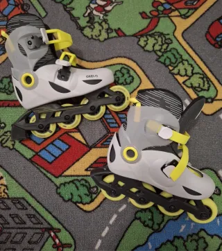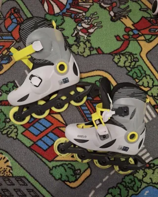Patines en línea oxelo talla desde la 32 a la 35. Tiene leves marcas de uso como se ve en las fotos.Mi hijo apenas los ha usado cuatro o cinco veces. Los envío con una bolsa ligera Decathlon y regalo protecciones de oxelo valoradas en 20 euros.