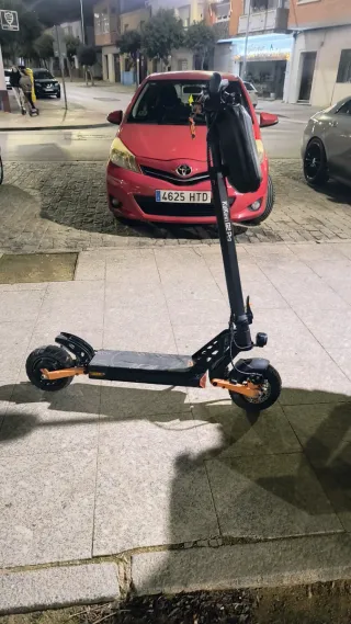 Patín eléctrico de color negro con detalles naranjas. Diseñado para ofrecer una experiencia de movilidad urbana. - Manillar ajustable. - Ruedas todoterreno. - Sistema de plegado rápido Precio negociable Batería cambiada hace poco Cambio por algo q me interese ‼️URGE VENTA‼️