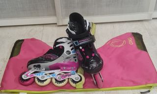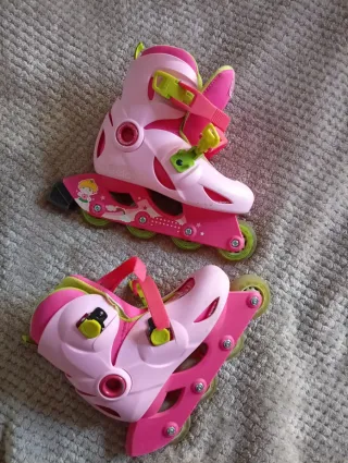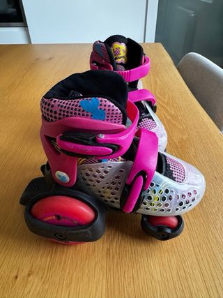 Patines en línea de color rosa, ideales para aprender a patinar. Son ajustables para adaptarse al crecimiento. - Tallas ajustables de la 29 a la 32. - Correa de seguridad para un mejor ajuste. - Dos posiciones de ruedas, en línea o una adelante y dos detrás para facilitar el aprendizaje. - Usado 3 veces. (precio nuevo 30€) SIN CAJA