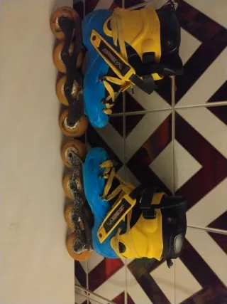 Patines infantiles con diseño de Minions, ideales para los más pequeños. Ajustables en talla. Las ruedas se pueden poner en dos posiciones diferentes (ver foto) en función de la habilidad del/a peque. Muy poco usado porque no le gustaba patinar. - Diseño divertido con personajes de Minions. - Talla ajustable de 29 a 32. - Tienen freno. - Incluye set de protecciones (Decathlon) talla XS negras