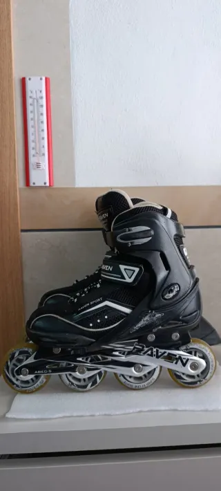 Se venden patines en línea Raven Sport . Incluyen protecciones. - Patines de color negro y plateado. - Cierre con cordones, velcro y hebilla. - Ruedas de 76mm. - Rodamientos ABEC-5. - Incluye juego de protecciones (muñequeras, coderas y rodilleras).