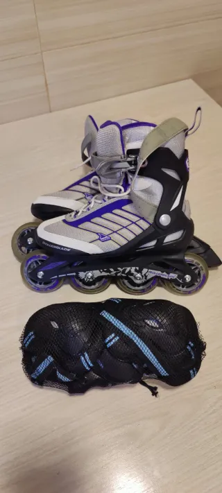 Vendo patines en línea Rollerblade de fitness/recreativos. Color gris, negro y morado. Ideales para iniciarse o patinar con comodidad. INCLUYE: Set de protecciones (rodilleras, coderas y muñequeras) en negro/azul. ¡Listos para rodar con seguridad! Talla Patines: 38 Estado: Muy cuidado (ver fotos). Protecciones con pequeños rasguños.