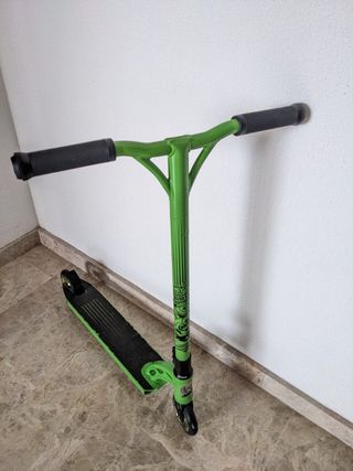 Este patín de tres ruedas tiene un diseño llamativo en verde y negro. - Puños de manillar verdes. - Plataformas de pie verdes con textura. - Ruedas delanteras y traseras negras.