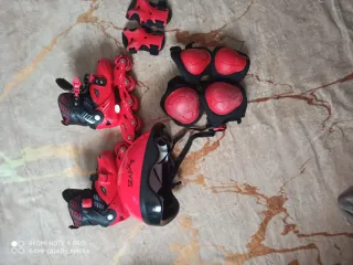Set completo de patinaje en color rojo, ideal para iniciarse. - Incluye patines ajustables. - Casco protector. - Protectores para rodillas y codos. - Protectores para muñecas.