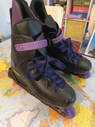 Patines en línea en color negro y morado, talla 41. Han sido poco utilizados (4 o 5 veces). Marca Joyskates - Cierre con velcro y cordones. - Ruedas moradas.