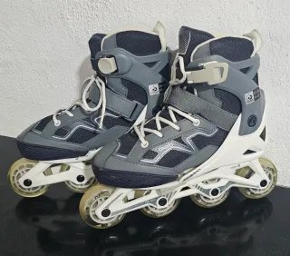 Patines en línea Oxelo de color gris y blanco. - Talla 35-39. - Ruedas de 76 mm. - Cierre con cordones, velcro y hebilla. - Marco ABEC-3.