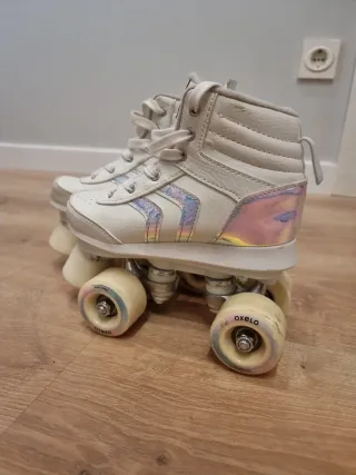 Patines de ruedas de caña alta en color blanco. - Diseño con detalles iridiscentes en los laterales. - Cierre con cordones. - Ruedas de color crema. - Marca Oxelo Quad 100 - Talla 32