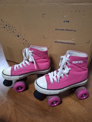 Patines de cuatro ruedas de la marca Roces en color rosa. - Diseño tipo bota alta. - Cierre con cordones blancos. - Ruedas de color rosa. Tienen desgaste pero no mucho uso, se habrán utilizado unas 5-6 veces.
