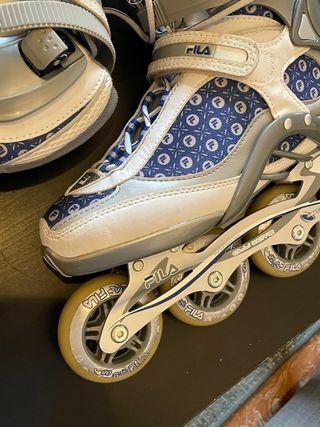 Patines en línea de la marca FILA, talla 38. Han sido usados muy pocas veces. - Diseño en color blanco, plateado y rosa. - Cierre con velcro y cordones. - Ruedas de poliuretano.