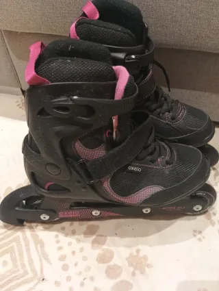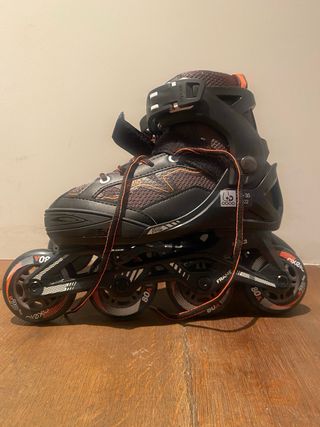 Patines en línea de la marca Oxelo, ideales para iniciarse en el patinaje. - Talla ajustable de 32 a 35. - Diseño en color negro con detalles en naranja. - Cierre con cordones y velcro para un ajuste seguro. Usado muy pocas veces. Como nuevo. Costaron 50€.
