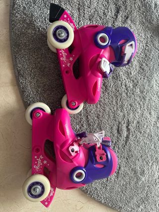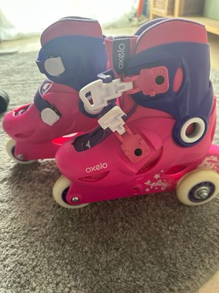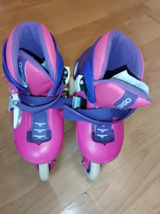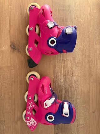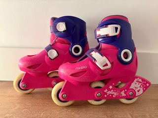 Patines infantiles de la marca Oxelo en color rosa y azul. - Talla 26-28. - Cierre de velcro y hebilla. - Ruedas de patinaje en línea. Las traseras se pueden cambiar de posicion.