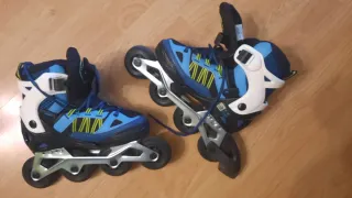 Patines en línea para niños, talla 35-38. Diseñados para ofrecer comodidad y estabilidad. - Color azul con detalles en verde lima. - Cierre de velcro y hebilla. - Ruedas de alta resistencia.