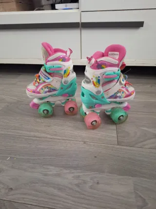 Patines infantiles con un diseño divertido de unicornios y arcoíris. -talla ajustable de 26 a 29. - Cierre de velcro ajustable. - Ruedas de colores. - Detalle de unicornio en la lengüeta.