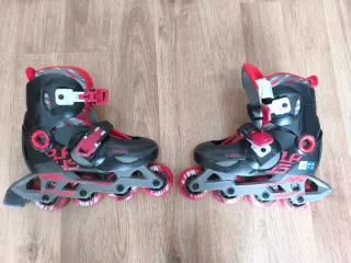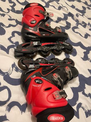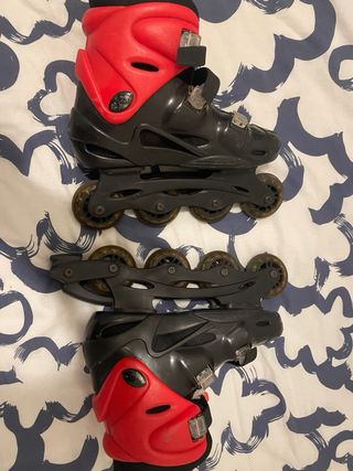 Patines en línea para niños, ideales para iniciarse en el patinaje. Ajustables y adaptables a la talla según crece el pie. Para edades aproximadas de 7-10 años. Usados un par de veces, estan nuevos. - Cierre de hebilla y velcro. - Cordones para un ajuste seguro. - Diseño deportivo en negro y rojo.