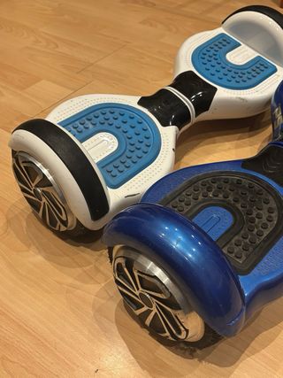 Se venden dos patines eléctricos tipo hoverboard, perfectos para desplazarse de forma divertida. - Color azul y blanco. - Diseño moderno con ruedas de aleación.