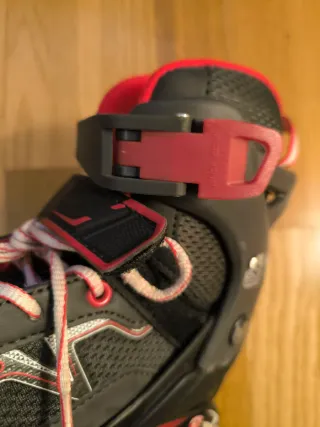 Patines en línea Rollerblade en talla 40.5. - Diseño en gris con detalles en rojo. - Cierre con velcro y cordones. - Ruedas de patinaje. - Bolsa de transporte incluida - Protecciones incluidas (rodilleras, coderas y muñequeras)