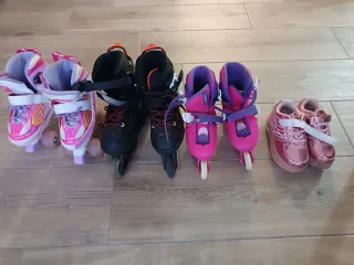 Lote de cuatro pares de patines de diferentes tallas. - Patines rosas con alas. Talla 28-31. - Patines negros en línea Decathlon. Talla 35-38. - Patines rosas y morados en línea Decathlon. Talla 28-30 - Zapatillas con ruedas rosas. Talla 31.