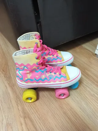 Patines de niña con un divertido diseño. - Color amarillo con detalles en rosa y azul. - Cordones rosas. - Ruedas de colores: dos rosas, una amarilla y una azul. Talla 36.